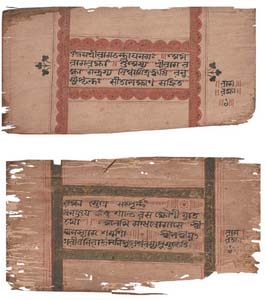 Rama Raksha Mantrasya is an illuminated manuscript with rubrication. The manuscript is made from tree bark and is decorated with gold designs along its borders. It is one of the two documented illuminated manuscripts from Manipur (the other is Ponbilang Sekning in Meitei Mayek, which we have scanned and documented in the Korbek Archive section, ARC.KA.0003). The colophon, which has a gold border on a green ground, provides information about the provenance of the manuscript. It mentions the copyist and the owner. The text was copied by Ganashyam Sharma and belonged to Maharaja Gharib Nawaz (b.1690-d.1752 CE).